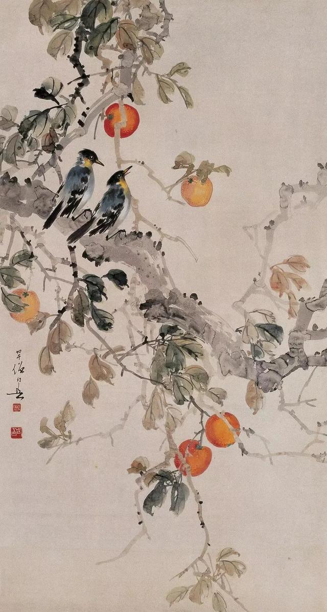 中国花鸟画家黄幻吾是广东新会人,绘有《红橘双禽图》。